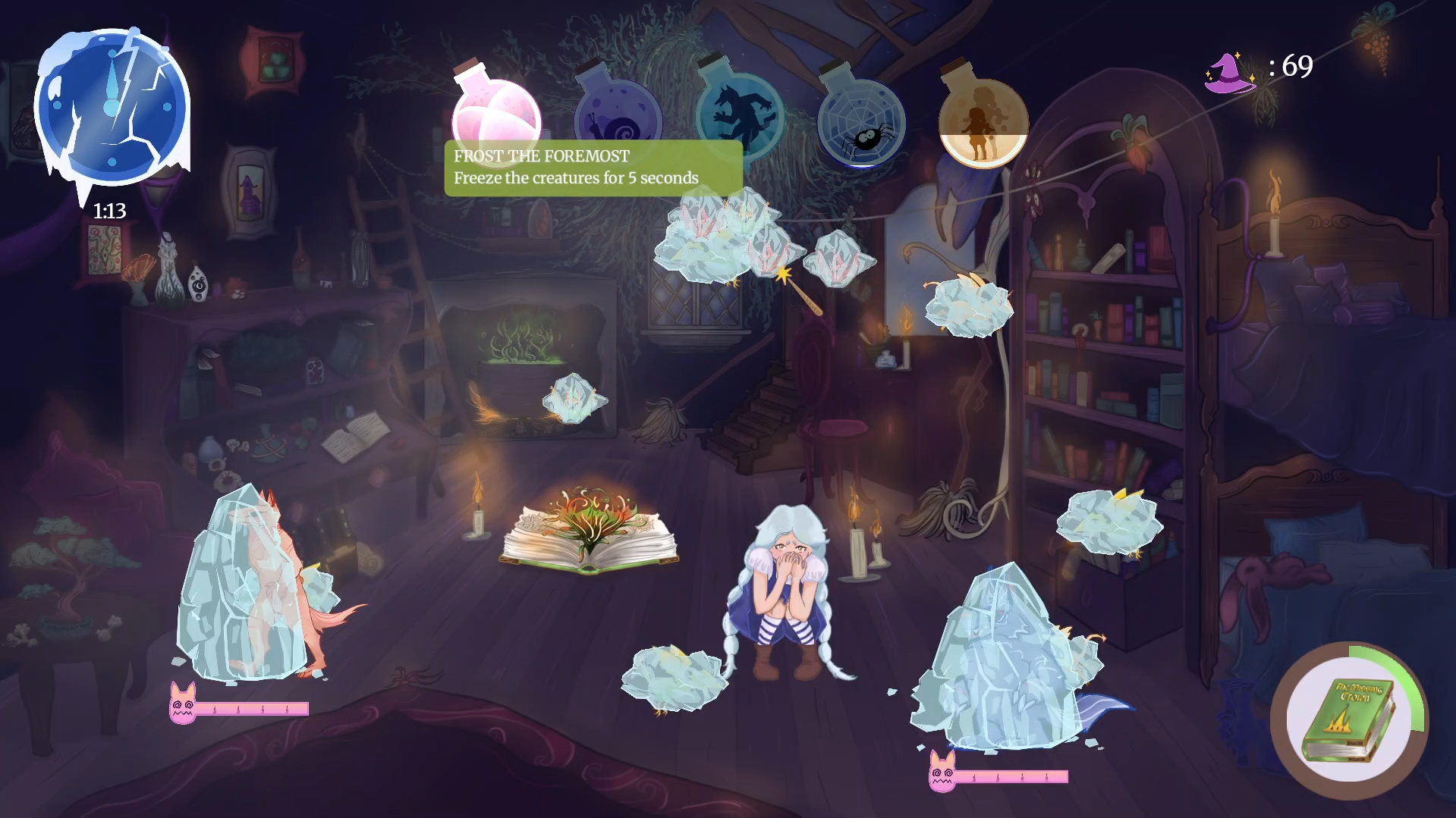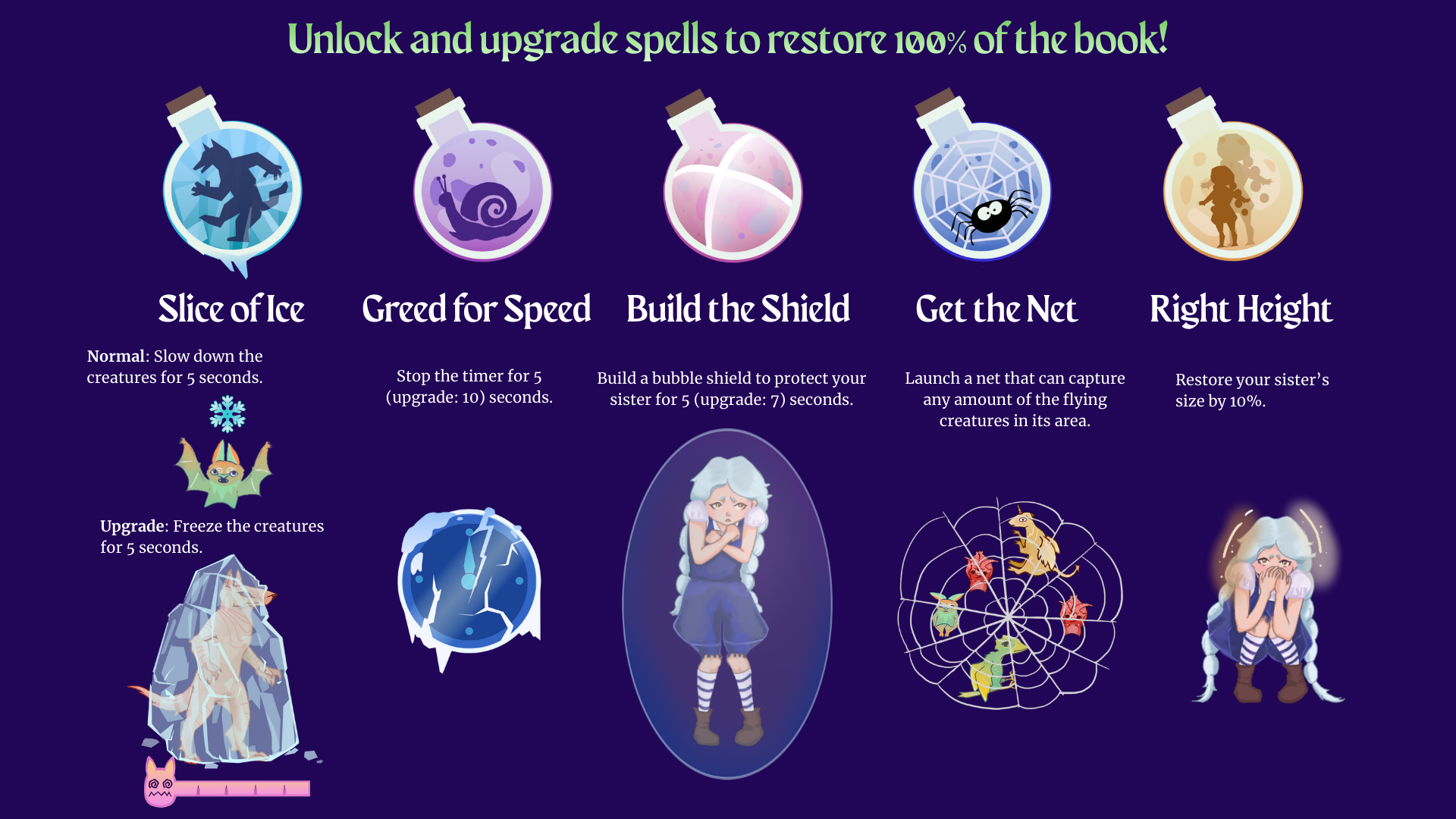 The spells only last two minutes, so be quick! And watch out for the big creatures! They can cast spells to shrink your little sister, and eventually trap her into the book… Protect her and don't let it happen!