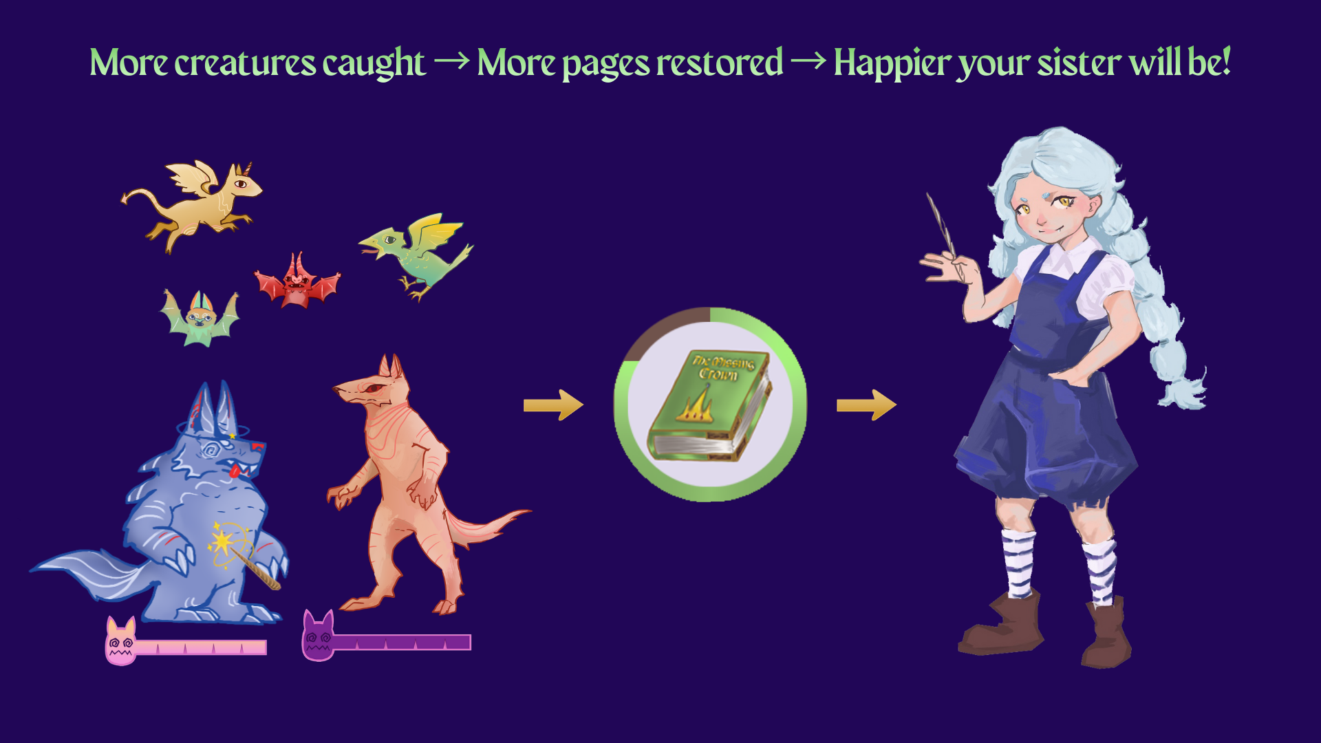 You must catch these creatures to seal them back in the book. The more you catch, the more pages will be restored and the happier she will be. The only way you can read the story with your sister is to restore all the pages (100%)!